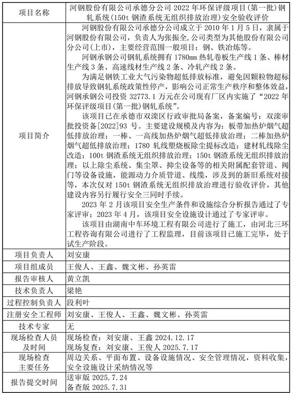 河鋼股份有限公司承德分公司2022年環(huán)保評級項目(第一批)鋼軋系統(tǒng)(150t鋼渣系統(tǒng)無組織排放治理)安全驗收評價