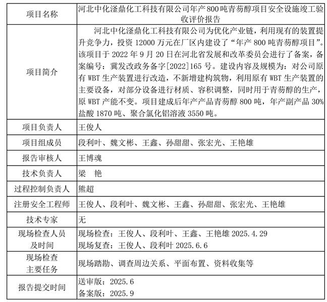 河北中化滏鼎化工科技有限公司年產(chǎn)800噸青芴醇項(xiàng)目安全設(shè)施竣工驗(yàn)收評(píng)價(jià)報(bào)告